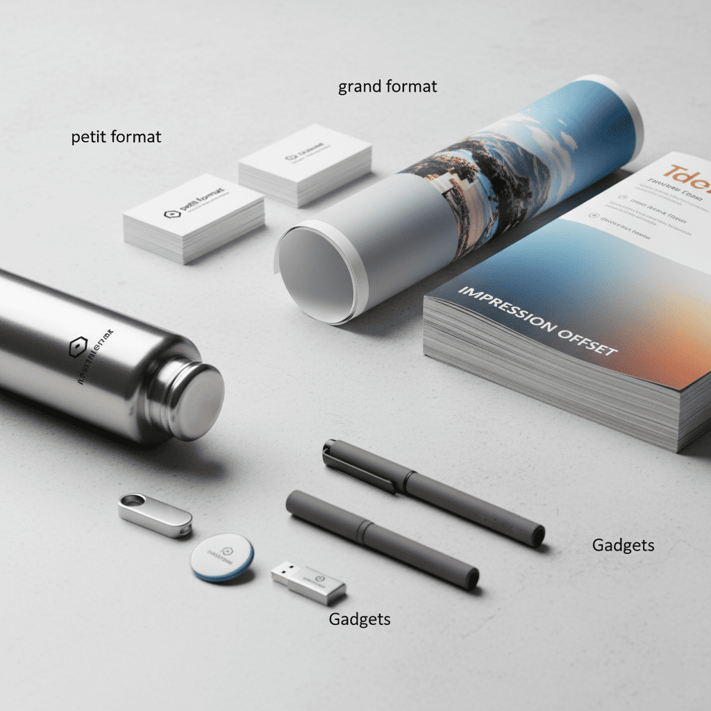 Impression numérique : idéale pour vos petites et moyennes séries avec une rapidité d’exécution optimale. Impression offset : parfaite pour les grandes quantités avec une qualité constante et un rendu professionnel. Objets et gadgets personnalisés : valorisez votre marque sur des supports du quotidien (stylos, tasses, textiles, agendas, etc.).